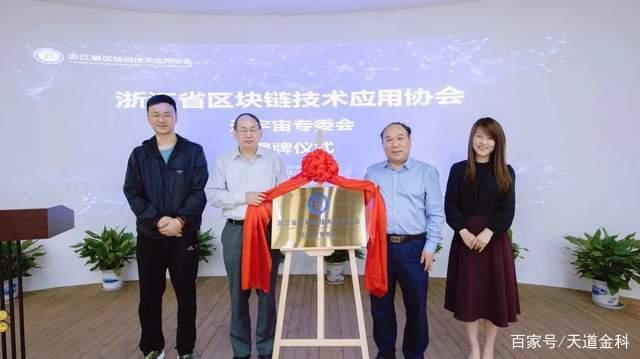 会议现场,浙江省区块链技术应用协会会长金雪军、浙江大学计算机科学与技术学院何钦铭教授、浙江省区块链技术应用协会执行副会长朱纪伟、浙江省区块链技术应用协会秘书长李琳共同为“元宇宙专委会”揭牌。金雪军会长为天道金科及其他首批加入元宇宙专委会的机构及企业颁发理事单位证书。