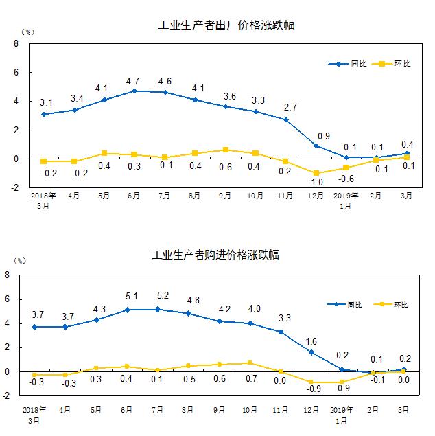 据国家统计局网站消息,2019年3月份,全国工业生产者出厂价格同比上涨0.4%,环比上涨0.1%;工业生产者购进价格同比上涨0.2%,环比持平。...