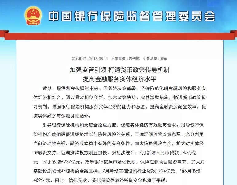 引导银行保险机构加大资金投放力度,保障实体经济有效融资需求。指导银行保险机构准确把握促进经济增长与防控风险的关系,正确理解监管政策意图,充分利用当前流动性充裕、融资成本稳中有降的有利条件,加大信贷投放力度,扩大对实体经济融资支持。近期贷款投放明显加快。据初步统计,7月新增人民币贷款1.45万亿元,同比多增6237亿元。指导银行按照市场化原则,保障在建项目融资需求,加大对基础设施领域补短板的金融支持。7月新增基础设施行业贷款1724亿元,较6月多增469亿元。同时,信托贷款、委托贷款等表外融资变化也趋于平缓。