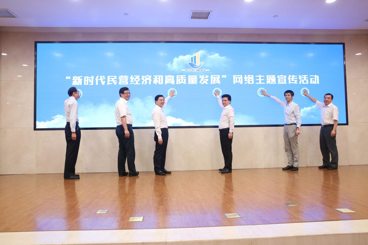 图为“新时代民营经济和高质量发展”网络主题宣传活动启动仪式暨研讨会现场。浙江省委常委、温州市委书记陈伟俊(左三),浙江省委宣传部副部长、省委网信办主任朱重烈(左二)等领导点亮活动标识。经济日报-中国经济网记者 张相成/摄影