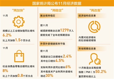 11月经济运行出现积极变化,工业增加值增速和市场销售增速明显加快。前11个月,城镇新增就业达1279万人,提前完成全年预期目标;外贸外资增速始终保持稳定。内需对经济增长的拉动继续增强,经济结构在改善;制造业采购经理指数回升,市场预期在改善。