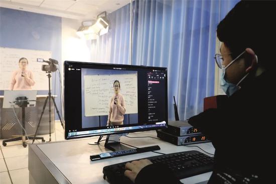 2月11日,山东省滨州市博兴县第三中学的工作人员利用电脑端实时监控“网络直播教学”进程,随时提供直播技术支持。2020年春季学期开学延期,博兴县第三中学利用网络直播设备搭建“网络直播教室”,组织教室按照课程轮值在“网络直播教室”当上“教学主播”。图/中新