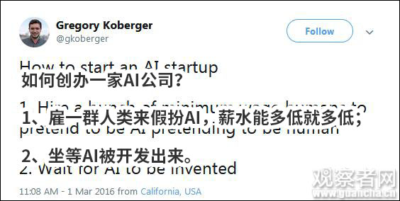 13日,《华尔街日报》再次评论了“伪人工智能”现象,称其为“机器学习”热潮和“零工经济”相结合的产物。