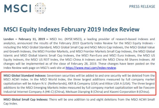 伦敦时间2月11日,MSCI公布了2019年2月MSCI股票指数季度指数评估结果,将在MSCI ACWI指数中增加17家公司,并移除1家公司。MSCI World Index新增的成员中,市场规模最大的三家企业分别是Adyen(荷兰)、KKR(美国)、以及Altice(美国)。MSCI新兴市场指数新增的市场规模最大的三个成员将是工业富联、美团点评和小米公司。