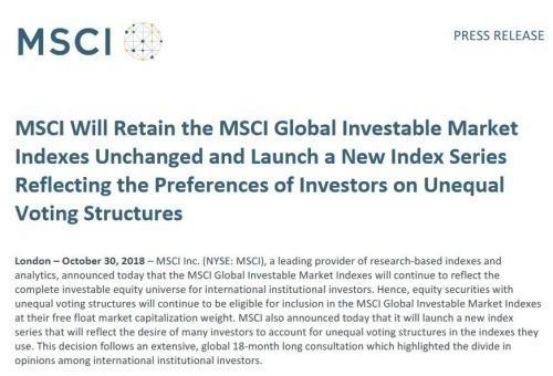 去年10月31日,全球第一大指数公司MSCI(明晟公司)公告称,将接受同股不同权企业,允许MSCI全球可投资市场指数(MSCI Global Investable Market Indexes)按原有标准计算其股份权重。
