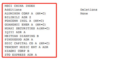 公告指出,MSCI CHINA INDEX将新增以下12家公司:中国铝业、哔哩哔哩、工业富联、广汇能源、华西证券、爱奇艺、美团点评(B)、拼多多、国投资本、腾讯音乐、小米公司(B)和中通快递。