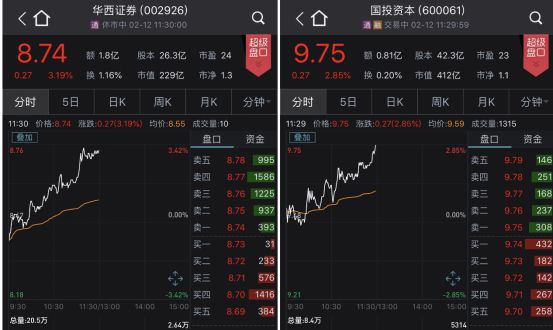 华西证券则涨势比较凌厉,今天上午一路震荡向上,截至上午收盘,报收8.74元,大涨3.19%。另外,国投资本也是震荡走高,截至上午收盘,报收9.75元,涨了2.85%。