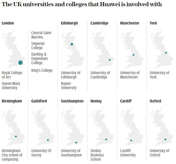 据不完全统计,英国仍有多所高校和研究机构与华为保持着不同程度和形式的合作关系。其中不乏剑桥、帝国理工、曼彻斯特大学等知名高等学府。