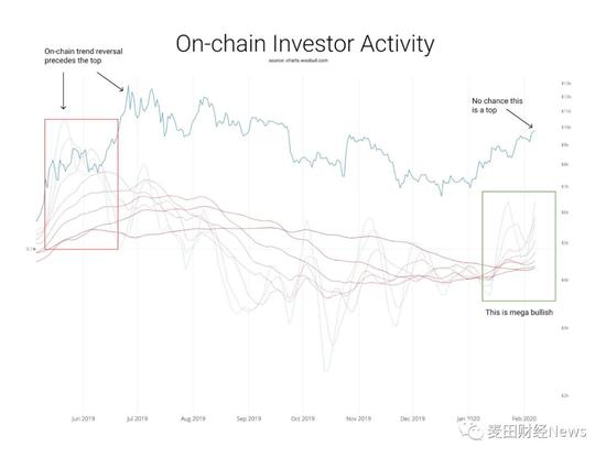 Willy Woo将比特币的实时价格与链上交易量的比率作为是寻找市场底部和顶部的信号。去年,当比特币的价格达到1.4万美元时,这一数值达到了近0.04。截至2月10日,该数值徘徊在0.018左右,这表明比特币的价格不太可能已经触底。2017年12月,当比特币价格达到2万美元的历史最高点时,这一数值达到了0.12的峰值。
