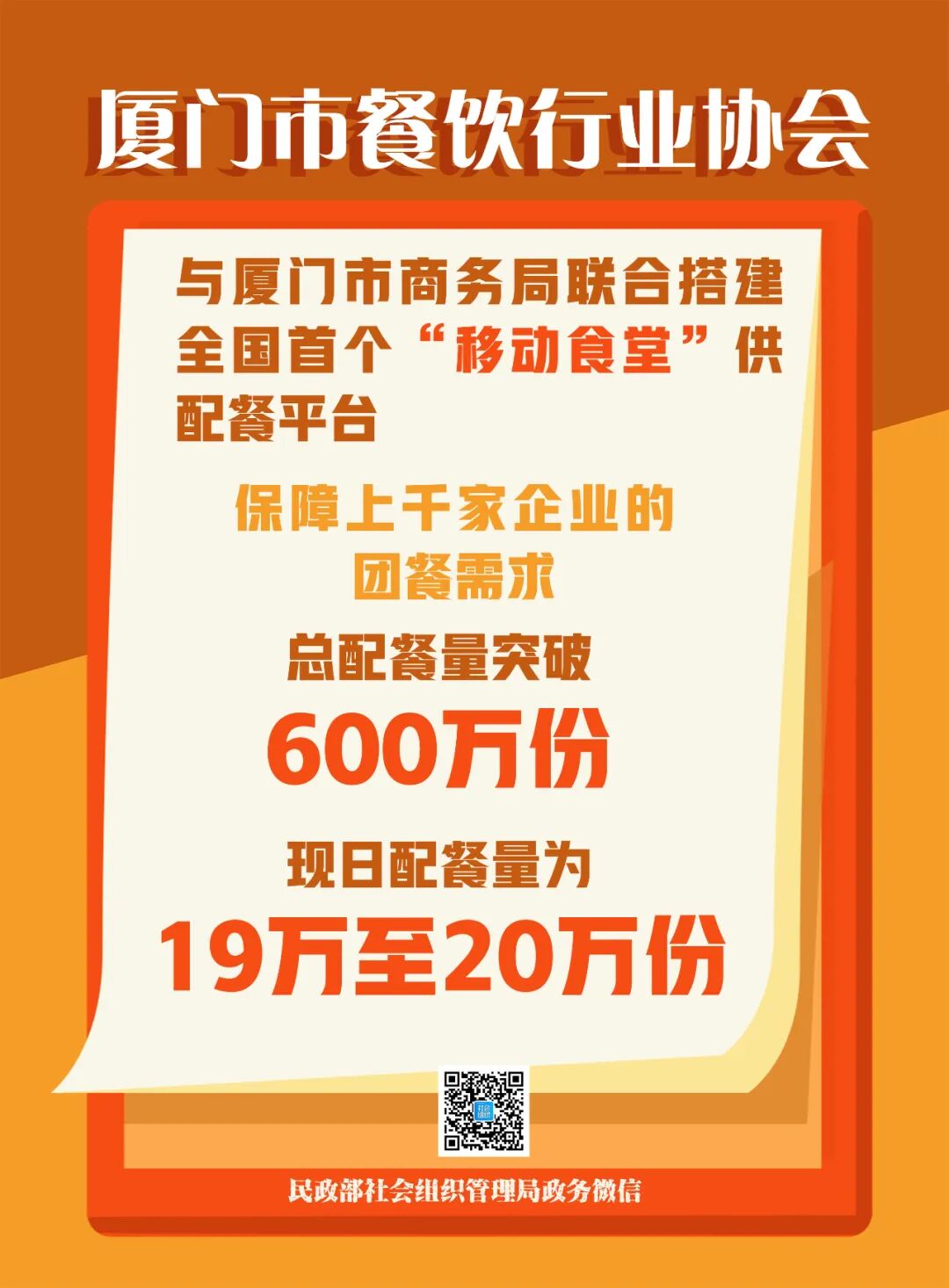 厦门市餐饮行业协会与厦门市商务局联合搭建起全国首个“移动食堂”供配餐平台,全力保障政府部门、企事业单位的团餐需求。先后推出供餐企业有20家,价格在每人每份10元至40元之间,品种和结算方式由订餐单位与供餐企业协商确定。据不完全统计,厦门市“移动食堂”供配餐平台保障了上千家企业的团餐需求,总配餐量突破600万份,现日配餐量为19万至20万份。
