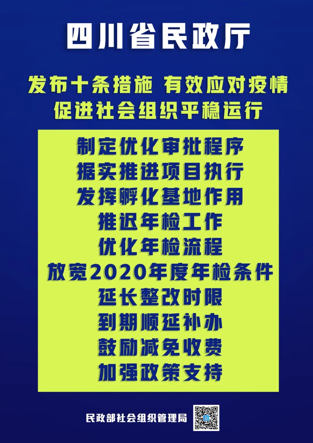 四川省民政厅3月23日印发有效应对疫情促进社会组织平稳运行10条措施:优化审批程序;据实推进项目执行;发挥孵化基地作用;推迟年检工作;优化年检流程;放宽2020年度年检条件;延长整改时限;到期顺延补办;鼓励减免收费;加强政策支持。
