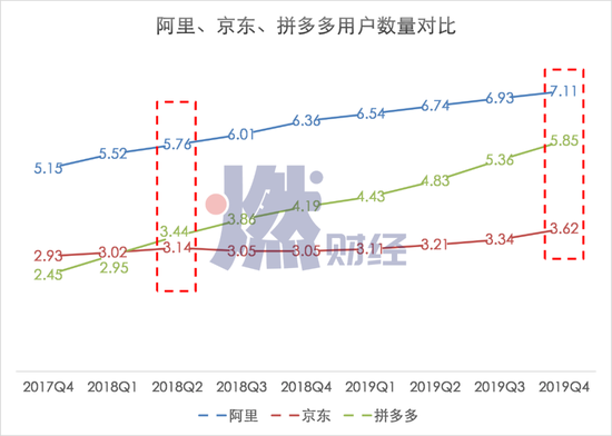 从此,中国电商格局发生改变。过去十年的“猫狗大战”,变成了“猫拼狗”大战。而在用户数量的竞争层面,则变成了阿里和拼多多的两强竞争。2019年底,拼多多跟阿里之间的用户数量差距,缩小到1.26亿。