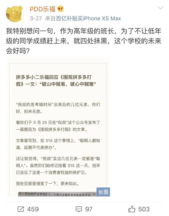 与其说这是一场技术层面的业务战,倒不如说这是一场公关战。3月27日,拼多多小二乐福再次发微博,称近日遭受了自媒体舆情攻击,影射阿里“作为高年级的班长,为了不让低年级的同学成绩赶上来,就四处抹黑”。