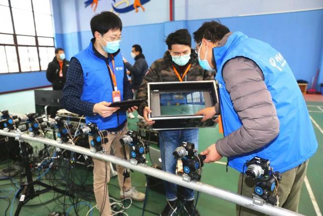 中国电信上海公司工作人员为直播体育课调试设备。图片由中国电信上海公司提供