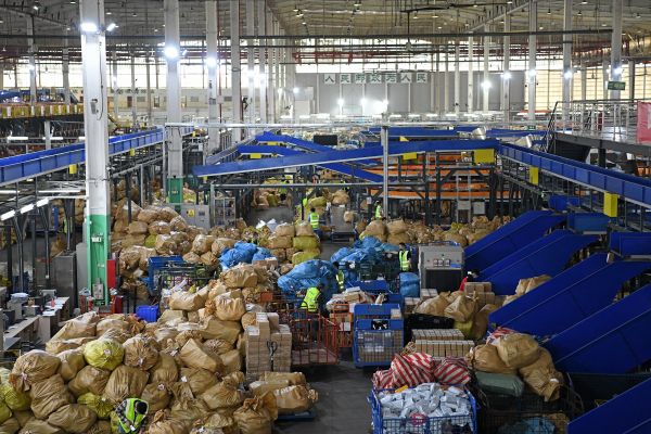 4月1日,在深圳邮件处理中心,工作人员在搬运邮件。(新华社)