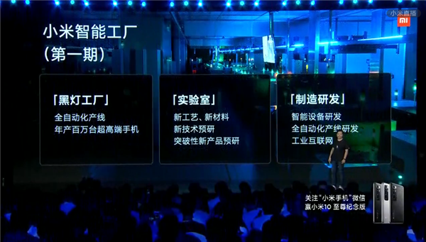 没错,今晚雷军就揭秘了小米智能工厂(第一期),据了解,小米智能工厂内部采用全自动生产线,甚至不用开灯,无人干预,一年就能产出百万台手机。