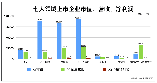 七大领域当中,企业总市值最高的是工业互联网,其次是人工智能和大数据;但在营收方面,城际高铁与轨道交通领域的企业创造了更高的营收;净利润方面,工业互联网、大数据、人工智能领域的企业有更好的表现。