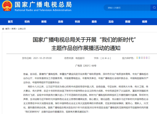 中国网科技10月29日讯 国家广播电视总局今日发布通知,决定自2021年10月起至2022年年底在全国广播电视和互联网视听节目服务机构开展“我们的新时代”主题作品创作展播活动。通知中中提到,要加强演员、嘉宾管理,注意选用社会形象积极正面、个人气质与角色适配、具有过硬演技实力的演员、嘉宾,坚决抵制违法失德人员,坚决反对唯流量论,严格执行片酬规定,严格把握表演风格、服饰妆容等。