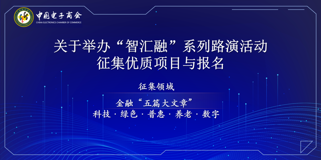 为贯彻国家“十五五”规划战略部署,落实金融领域“科技金融、绿色金融、普惠金融、养老金融、数字金融”五篇大文章建设要求,中国电子商会重磅打造的“智汇融”系列路演活动正式启动!活动采用线下闭门对接 + 线上云智汇双线联动模式,链接头部资本、政企资源、产业链龙头,现面向全球公开征集优质创新项目,诚邀怀揣梦想的创业者与深耕行业的投资人共赴盛宴!