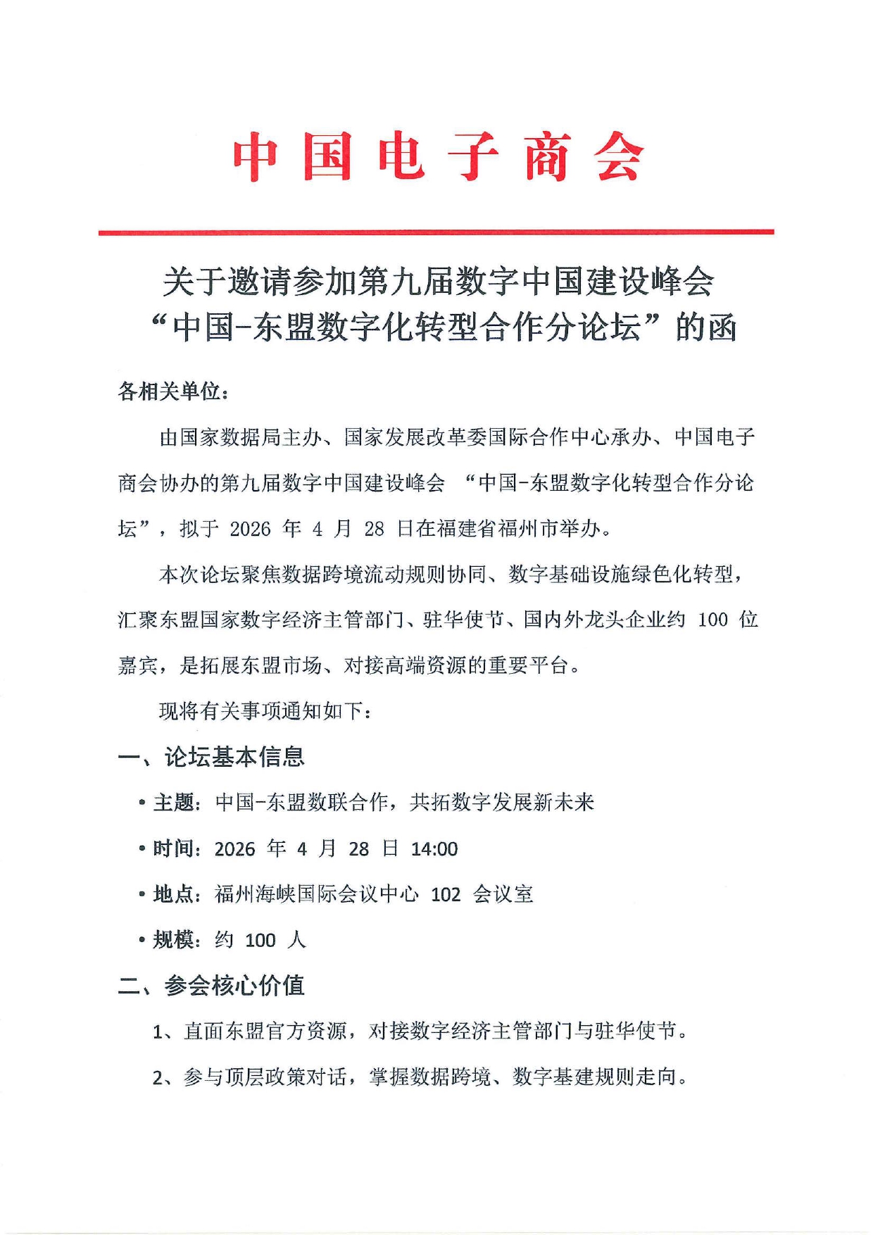 关于邀请参加第九届数字中国建设峰会“中国-东盟数字化转型合作分论坛”的函