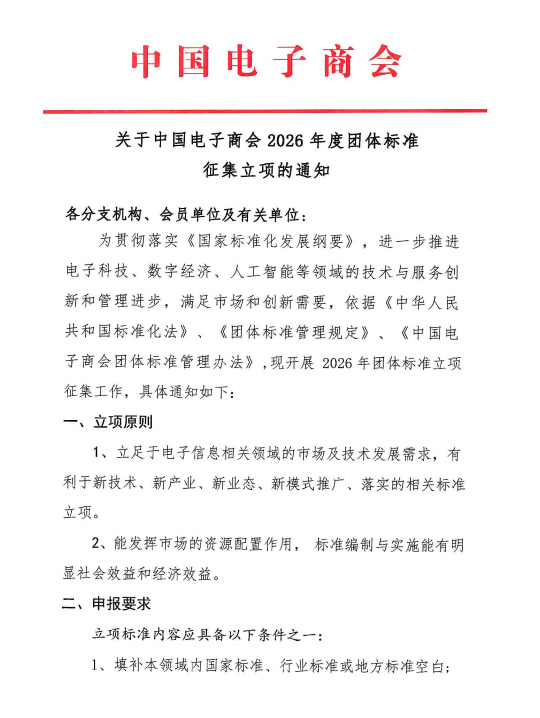 关于中国电子商会2026年度团体标准征集立项