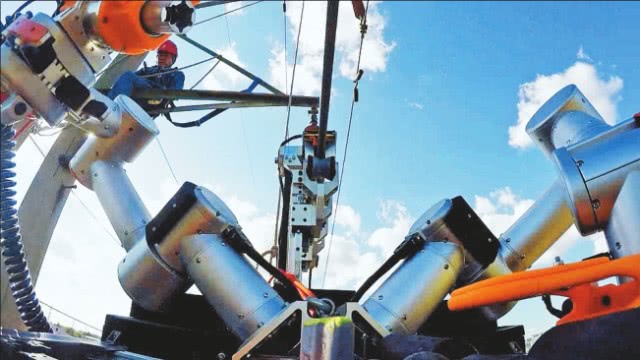 机器人由站在铁塔上的电力工人吊装上线后处理高压线螺栓松动缺陷。...