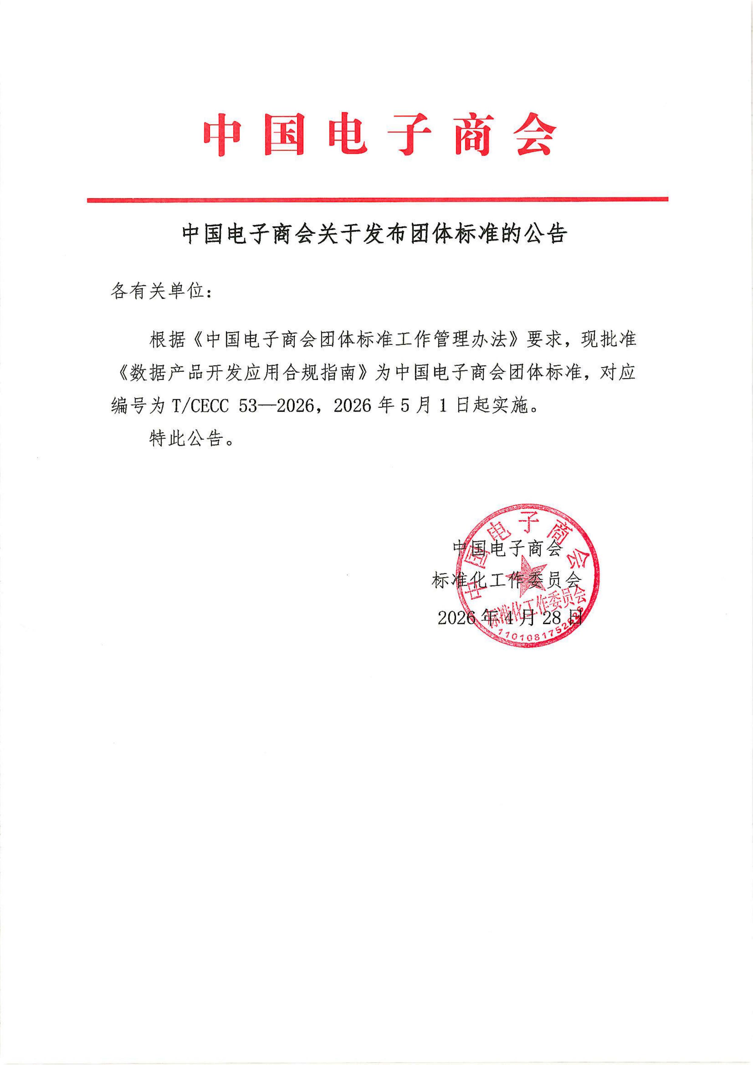 中国电子商会团体标准发布公告-《数据产品开发应用合规指南》