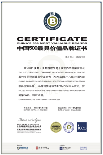 近日,由世界品牌实验室(World Brand Lab)主办的(第十八届)“世界品牌大会”在北京举行,会上发布了2021年《中国500最具价值品牌》分析报告,在这份基于财务数据、品牌强度和消费者行为分析的年度报告中,长虹品牌价值达1736.29亿元人民币,再创新高。